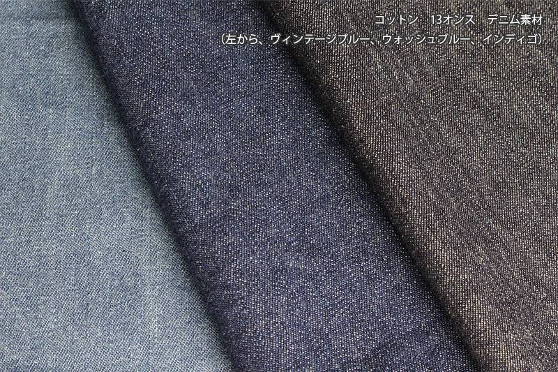- デニム生地は経糸にインディゴ染色した糸を、横糸には晒糸を使用しています。